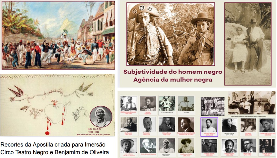 Vou compartilhar aqui cinco imagens de apostilas que venho criando para trazer reflexões sobre as subjetividades negras e como elas foram (e ainda são) apagadas, distorcidas ou simplificadas. A primeira imagem é uma pintura do século XIX, que retrata uma folia de reis.Eu defendo que a própria origem do circo, do picadeiro, precisa ser desvinculada apenas da Europa para considerar influências negras, ciganas… A subjetividade branca que domina a historiografia não se desfaz de seus “pais fundadores”, define quem faz “revoluções” e quem faz “revolta”. Organiza a linha do tempo “universal” a partir dos marcos racistas e suaviza crimes com eufemismos: estupradores viram “senhores de engenho”, sequestradores de pessoas viram “proprietários”.